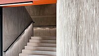 Im Inneren spielt Ortbeton die Hauptrolle: 380 m² Stahlbetonwände wurden – teilweise auf gebogenen Schalungen – mit der RECKLI SELECT-Strukturmatrize 2/187 Abruzzo gestaltet. Die stromlinienförmigen, unterschiedlich breiten Rillen verleihen Treppenhäusern, Foyers und Meetingbereichen eine subtile Dynamik. Weil das elastische Material der Matrizen sich mühelos an Radien anschmiegt, laufen die Linien selbst in Kurven stoßfrei weiter und betonen die fließende Raumführung. Kombiniert mit warmen Deckenelementen, farbigen Akzenten und präzise geführtem Licht entsteht ein einprägsames Wechselspiel aus Haptik und Atmosphäre, das Besucher*innen schon beim Betreten des Gebäudes empfängt.