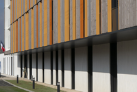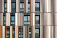 Oben strukturieren vertikale Holzlamellen in warmen Tönen die Fassade; sie filtern Licht, geben den Zimmern Privatheit und übernehmen den Sonnenschutz. Unten nimmt die Sockelzone dieses vertikale Motiv auf: Die mit der Strukturmatrize ILLER hergestellten, hellen Sichtbetonflächen zeigen eine feine, senkrechte Holzstruktur. Das Ergebnis ist eine ruhige, durchgängige Tektonik, in der warme Holzoberflächen und robuster Beton präzise aufeinander abgestimmt sind.