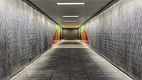 Mit leuchtenden Farben und strukturiertem Sichtbeton wird aus einem dunklen Tunnel eine einladende Unterführung.