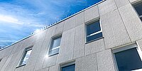 Entstanden ist ein zweiteiliges Gebäude, das von außen mit einer klaren, minimalistischen Linienführung besticht. Die Fenster des oberen, höheren Teils – in dem auch die Bühne untergebracht ist – sind rhythmisch angeordnet. Interessantes Detail: Die Fassade aus Strukturbeton, die mit ihrem leicht brutalistisch anmutenden Charakter auf die im Hintergrund aufragenden Wohnblocks anspielt. Verwendet wurde dafür die Strukturmatrize 2/87 B Ohio aus der RECKLI SELECT Serie. Gegossen wurden die Betonelemente im Fertigteilwerk von PEBEK unter Verwendung von Sichtbeton der Klasse 4.