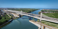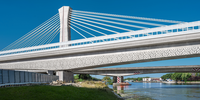 Die Brücke überspannt die Wasserläufe und Felder mit großer Ruhe. 380 m Länge, 180 m Hauptspannweite – und dennoch wirkt der Betonüberbau erstaunlich leicht. Entscheidend ist die klare Gliederung der Oberfläche: oben eine glatte unauffällige Fläche, unten ein Band aus einem verspielten Wellenmuster.