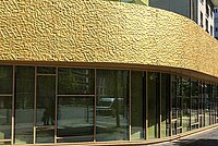 Der rote – oder besser gesagt goldene – Faden des Wohnkomplexes bildet eine Betonstruktur, für die Strukturmatrizen der RECKLI SELECT Serie 2/151 Gironde verwendet wurden. Und die sich nahezu überall an der Fassade wiederfindet. Dadurch werden die einzelnen Gebäude nicht nur optisch zusammengehalten, sondern auch vom umliegenden städtischen Raum abgegrenzt. Auf ganzen 1500 m2 zieht sich diese Struktur, die ein wenig an ein zusammengeknülltes Papier erinnert, durch den Wohnblock – und ist in Verbindung mit der goldenen Farbe eines der visuellen Highlights des Komplexes. Damit sich daran auch so schnell nichts ändert, wurde der Sichtbeton zum Schutz mit KEIM Concretal-Lasur behandelt.