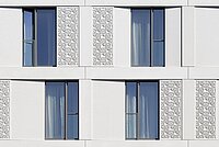 Tschoban und Voss haben sich für ein orientalisches Muster aus dem Katalog der mehr als 200 RECKLI-Betonstrukturen entschieden, das einen verspielten und eleganten Charakter an die Fassade bringt. Die kreisförmigen Muster mit floralen Elementen ziehen die Blicke von Passanten und Besuchern auf sich und fügen sich bei längerem Betrachten zu verschiedensten Mustern zusammen.