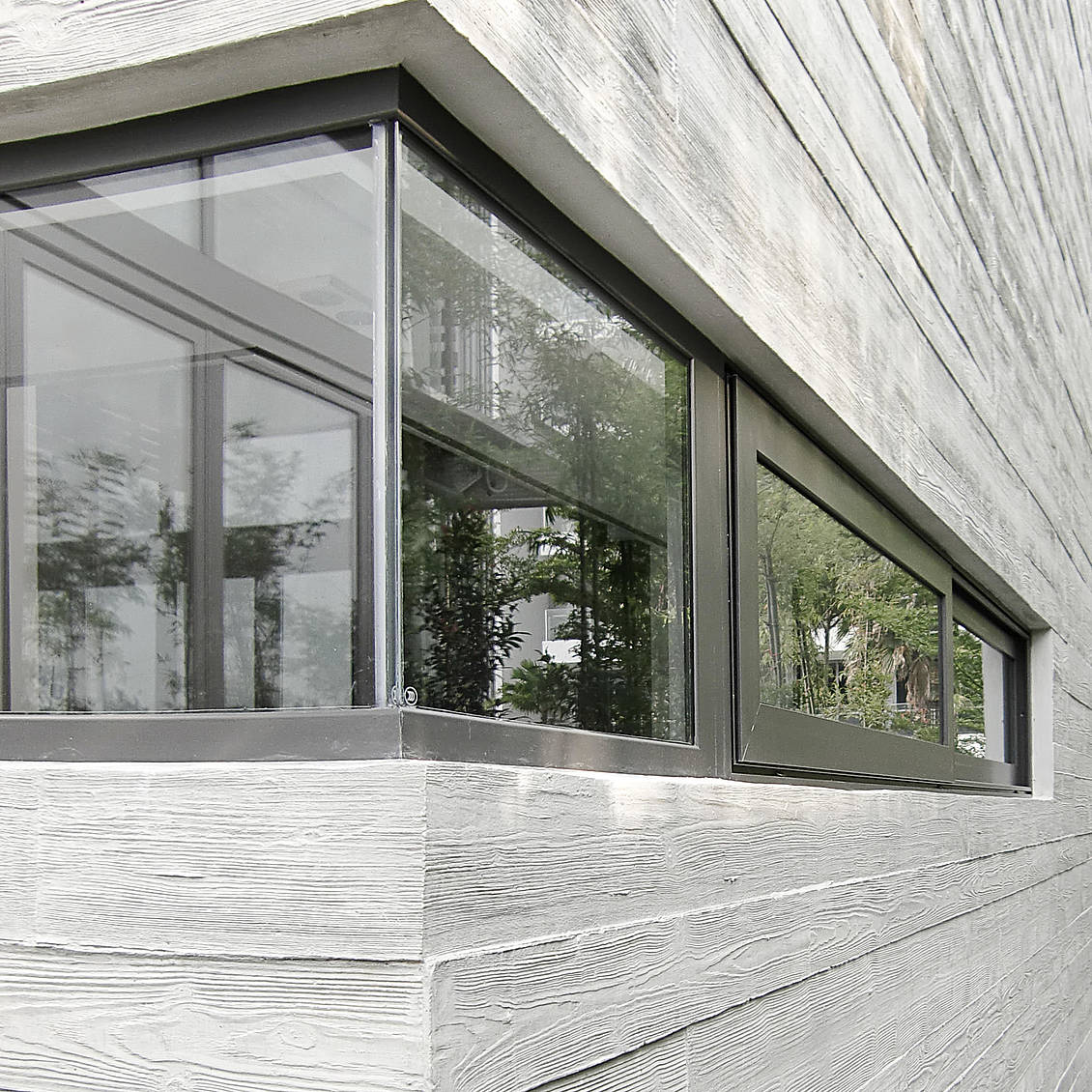 Une structure de bois horizontale avec des planches irrégulières montées jointives. Les planches sur différents plans animent la façade.