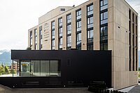 Érigé dans un emplacement de choix et visible de loin, le nouveau bâtiment séduit par ses deux parties contrastantes. Alors que le corps principal arbore des tons naturels délicats, l'annexe se distingue nettement par sa façade noire. Ce contraste est encore accentué par la différence de hauteur entre les deux parties du bâtiment. Les fenêtres, astucieusement placées, assurent une abondance de lumière naturelle dans les espaces et préviennent la surchauffe en été. Un système de refroidissement gratuit, le chauffage urbain et une grande installation photovoltaïque sur le toit assurent une efficacité énergétique supplémentaire.