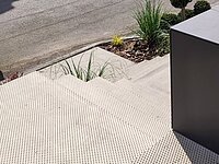 Pour cette application, la matricé structurée 2119 Pikes a été utilisée. La texture de surface marquée améliore nettement la résistance au glissement et assure un haut niveau de sécurité au quotidien. Les escaliers atteignent la classe de résistance au glissement R13, la plus élevée, répondant ainsi aux exigences les plus strictes pour les escaliers extérieurs.