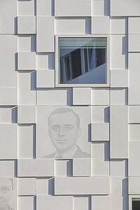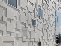 Le défi particulier: à la demande des clients, les différentes photogravures ont été ajustées aux formes spéciales; il devrait même être possible de les remplacer pour installer les différents portraits sur la façade. Les éléments sont installés sur une façade-rideau. Le béton a été teint en couleur claire grâce à du ciment blanc et répond à la classe 4 de béton brut.