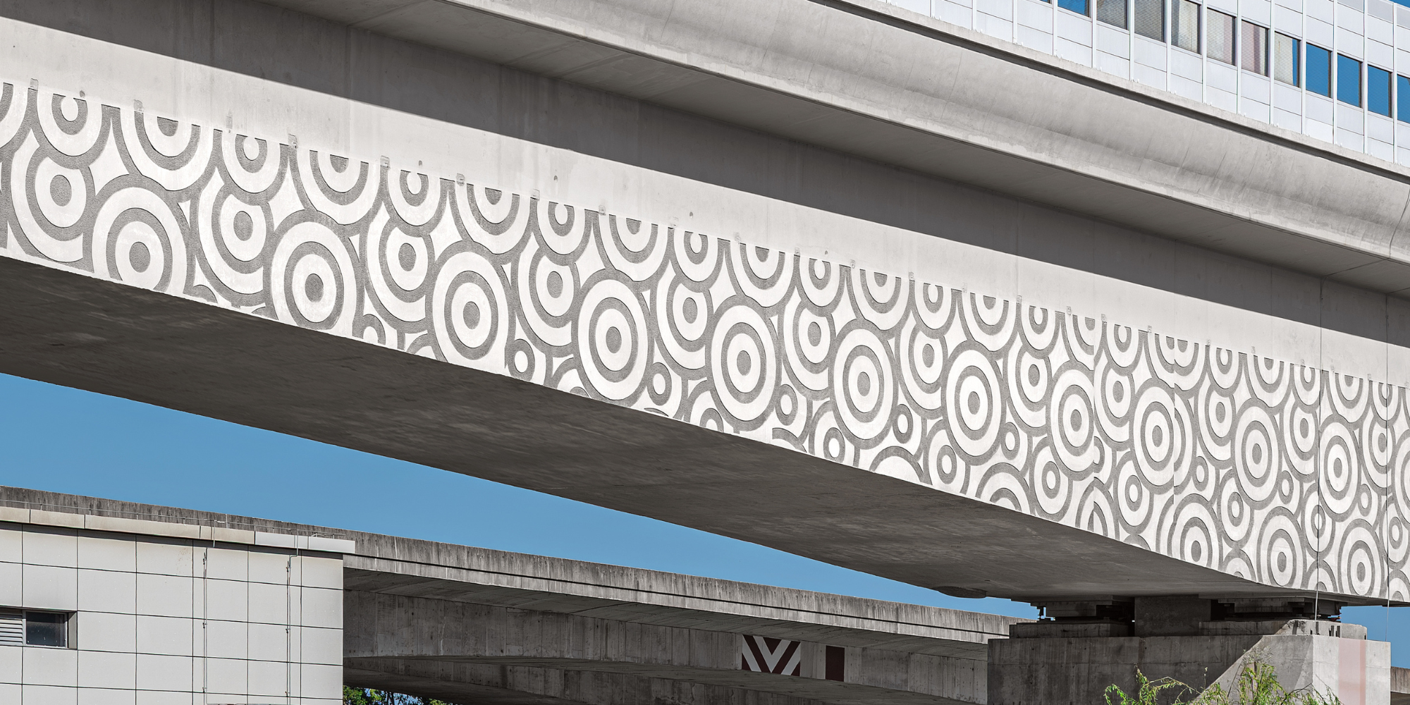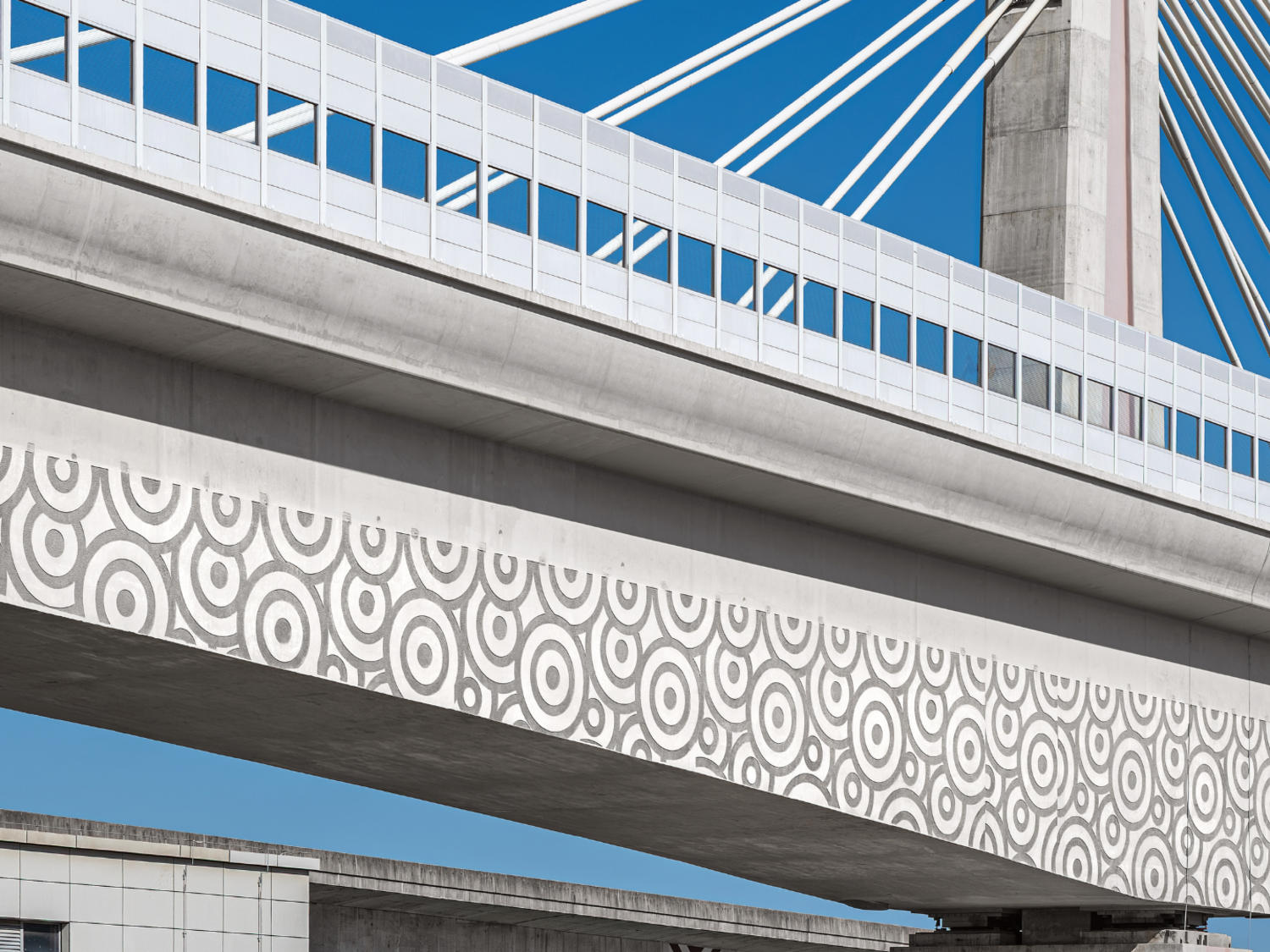 La zone supérieure reste volontairement sobre, réalisée en béton apparent lisse. Le long de la face extérieure inférieure du caisson court une bande composée de grandes ondulations circulaires. Avec un diamètre extérieur de 2,2 mètres, le motif a été délibérément dimensionné à grande échelle afin de rester lisible même à distance. De près, la granulation fine de la surface renforce encore le contraste visuel.