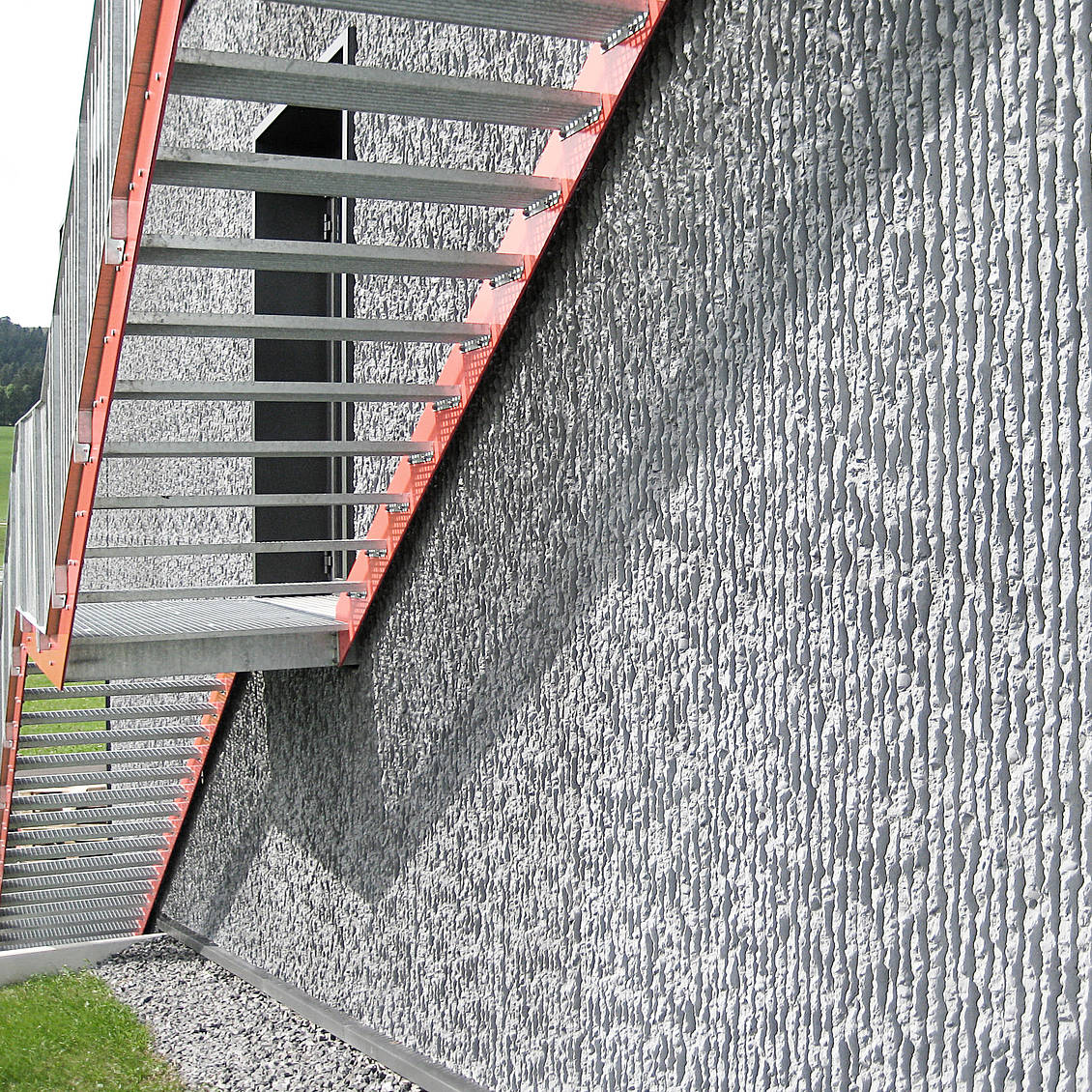Ribs, broken ribs and wave patterns lend a building either lightness or solidity. They can pick up the existing lines of a structures part and give it additional contours. They enable straight-lined and esthetic pattern directions and can be realized chipped and broken, horizontally, vertically and diagonally. When applied to noise insulation walls, ribs and waves can enlarge the surface and combined with the correct concrete even contribute to higher noise absorption levels.