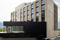 The new construction – prominently located and highly visible – features two contrasting building parts. While the main body of the structure is kept in delicate natural tones, the extension stands out distinctly with its black facade. The contrast is further enhanced by the differing heights of the two building parts. Skillfully placed windows provide ample natural light in the rooms and prevent overheating in the summer. Additional energy efficiency is ensured by a free-cooling system, district heating, and a large photovoltaic system on the roof.