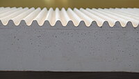 The pattern 2/94 Orinoco was chosen – one of over 250 designs in RECKLI’s SELECT series. Orinoco was used to apply an even wave structure to the concrete, with elevations sticking up by 35mm. With this texture, the façade plays host to an aesthetic interplay of light and shadow as the sunlight wanders over it throughout the day. Light sources create a similar effect inside, so the architects employed Orinoco for the internal architectural concrete too. One formliner at 1,220mm x 5,000mm and one measuring 1,220mm x 2,000mm were used to create the harmonious design on 2,000 square meters of exposed concrete in total. The precast elements for the inside and outside were made in the Argomex precast plant. Corvin 5 was finished in 2019 and was nominated to the Office of the Year Award shortlist.