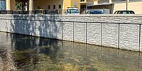 The flood protection wall was built as a supporting wall. To give the wall an attractive, natural design, formliners from the RECKLI SELECT range were used. The 2/164 Brabant design applied a horizontal, slanting brickwork texture to the concrete. The concrete was processed in a precast concrete plant as well as in-situ.
