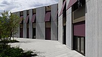 The new build continues the style of the façade, albeit with a unique design detail. Full-height windows and concrete elements dominate the façade, which was constructed as a curtain façade. The design of the concrete elements involved two RECKLI textured formliners from the SELECT series. The formliners were provided measuring in at 7.4 by 3.8 meters. The 2/42 Naab design is a fantasy texture with lines that subtly break up the concrete. The precast concrete elements were produced at the Istighofen precast plant.