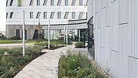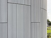 The façade stands out with its precisely crafted exposed concrete surface, created using the RECKLI 2/98 Moldau formliner. Stretching over 600 square meters, parallel grooves of varying widths and depths flow continuously across the surface. Despite the pronounced texture, the concrete remains smooth and refined, giving the façade an elegant, high-quality finish. This structured concrete pattern complements the building’s flowing, organic form and creates a distinctive architectural accent. The precast concrete elements were manufactured and installed by FDB – United Forms.