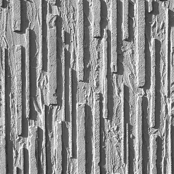 An abstract pattern with a coarse surface texture. Differently-sized sticks are arranged at varying heights and enliven the façade.